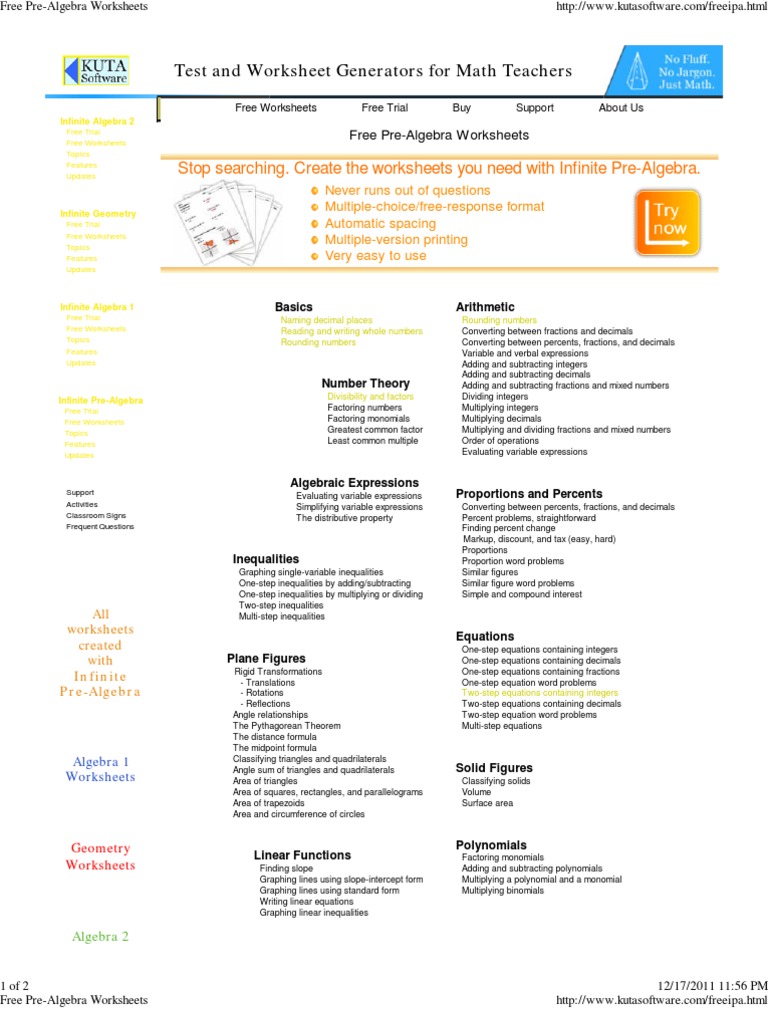 Free Printable Math Worksheets for Algebra 1 - Kuta Software Finding slope from a graph. Finding slope from two points. Finding slope from an equation. Graphing lines using slope-intercept form. Graphing lines using standard form. Writing linear equations. Graphing linear inequalities. Graphing absolute value equations. Direct variation. free printable spring math and science worksheets 2nd Grade Math Story Problems! Differentiated math word problems to scaffold independent problem solving on math story problems! Seasonal math fun with Fall math story problems, Winter math story problems, Spring math story problems and Summer math story problems included! 144 unique story problems with three different levels of difficulty! Algebra Workshets -- free sheets(pdf) with answer keys Enjoy these free pintable sheets. Each one has model problems worked out step by step, practice problems, as well as challenge questions at the sheets end. Plus each one comes with an answer key. Algebra. Distance Formula. Equation of Circle. Factoring.